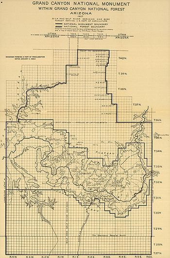 The Grand Canyon is a steep-sided gorge carved by the Colorado River in the United States in the state of Arizona. It is largely contained within the Grand Canyon National Park, one of the first national parks in the United States. President Theodore Roosevelt was a major proponent of preservation of the Grand Canyon area, and visited it on numerous occasions to hunt and enjoy the scenery. The canyon was created by the Colorado River over a 5.4 million year period. The canyon is 277 miles (446 km) long, ranges in width from 4 to 18 miles (6.4 to 29 km) and attains a depth of over a mile (1.83 km) (6000 feet).[1] Nearly two billion years of the Earth's geological history have been exposed as the Colorado River and its tributaries cut theirchannels through layer after layer of rock while theColorado Plateau was uplifted. The "canyon began in the west, followed by another that formed in the east. Eventually, the two broke through and met as a single majestic rent in the earth, more commonly referred to as the "Grand Canyon Event" approximately 5.4 million years ago. [...] The merger apparently occurred where the river today bends to the west, in the area known as the Kaibab Arch."[2] The major form of the canyon was created by this event. The Colorado River continued to erode and form the canyon to the point we see it as today.[3] Before European immigration, the area was inhabited by Native Americanswho built settlements within the canyon and its many caves. The Pueblo people considered the Grand Canyon ("Ongtupqa" in Hopi language) a holy site and made pilgrimages to it.[4] The first European known to have viewed the Grand Canyon was García López de Cárdenas from Spain, who arrived in 1540.[5]